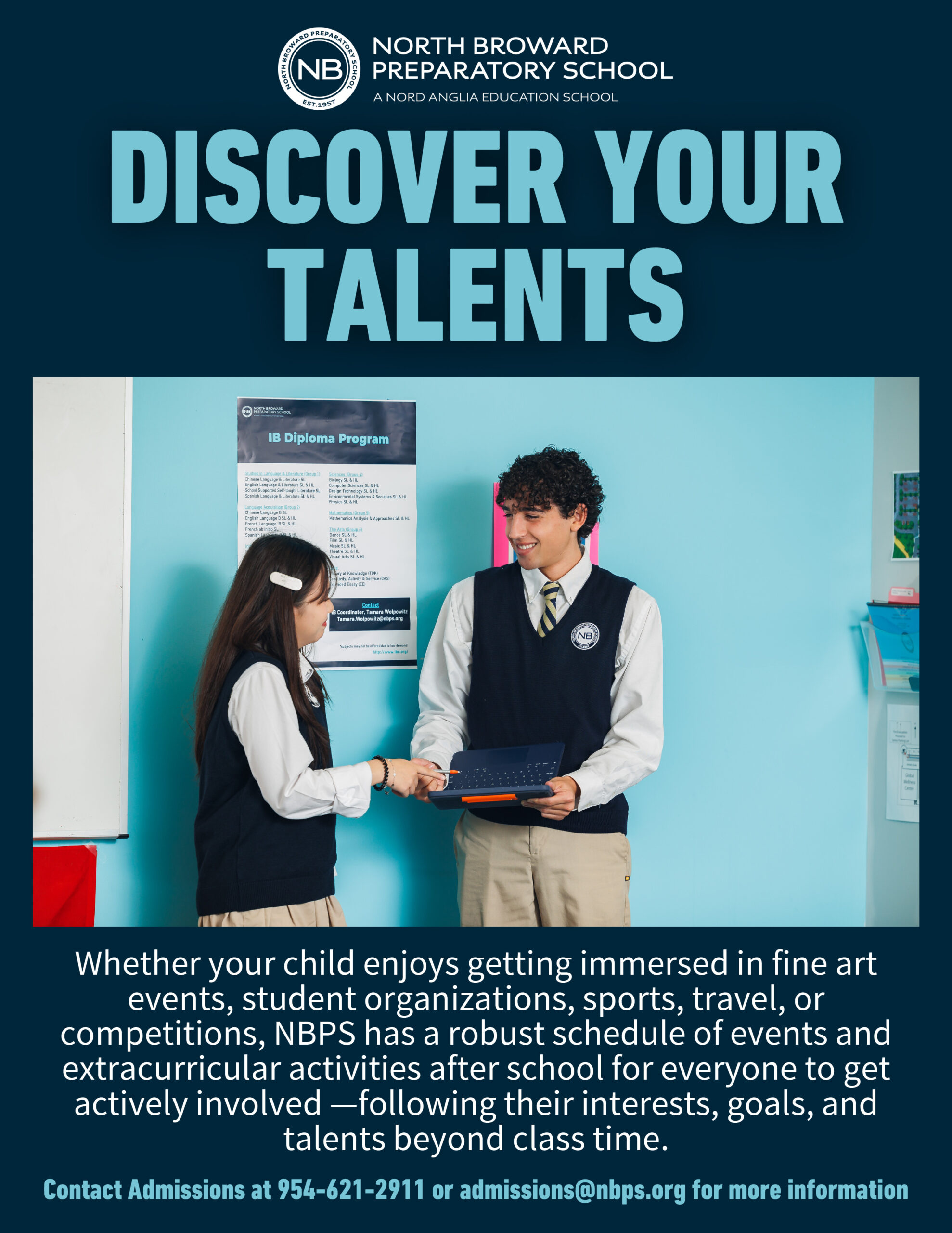 North Broward Preparatory School (NBPS), is a premier PK3 through 12th grade day and boarding school. As a member of Nord Anglia Education, NBPS empowers students through partnerships with world-leading institutions and organizations seamlessly integrated within the curriculum. Our international and innovative approach to education, featuring recognized academic programs, maximizes individual achievement, and helps students discover their passions in a transformative, nurturing environment. The only private school in Broward and Palm Beach County that offers such a high level of collaboration and partnerships, opening a world of possibilities for your child’s future.